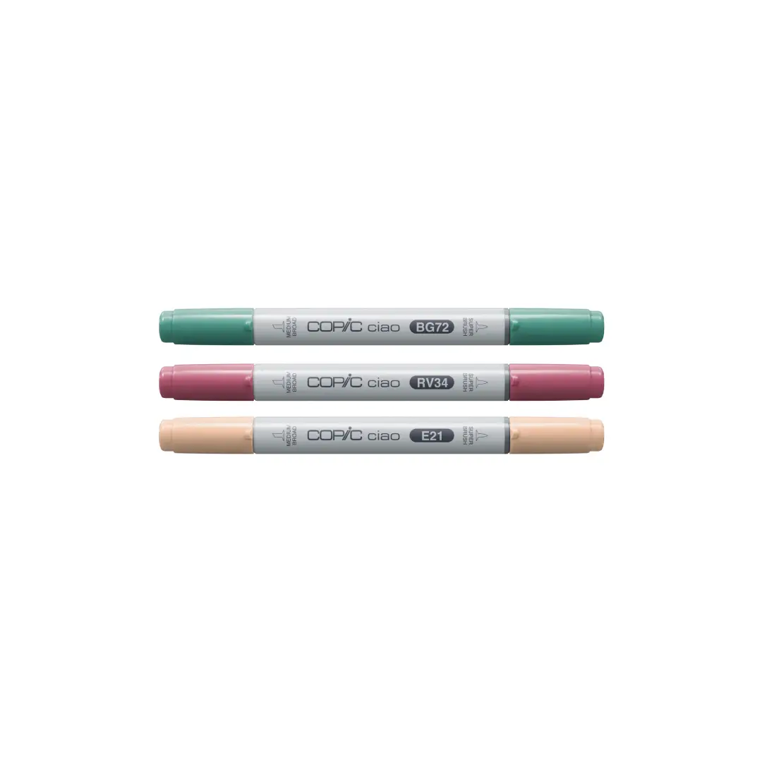 The Copic Ciao Mix & Layer Set – Vibrant Palette offers BG72, RV34 and E21 markers. Easy to control, refillable, and eco-friendly, this beginner friendly set delivers translucent colours for layering, blending, and creative exploration.
