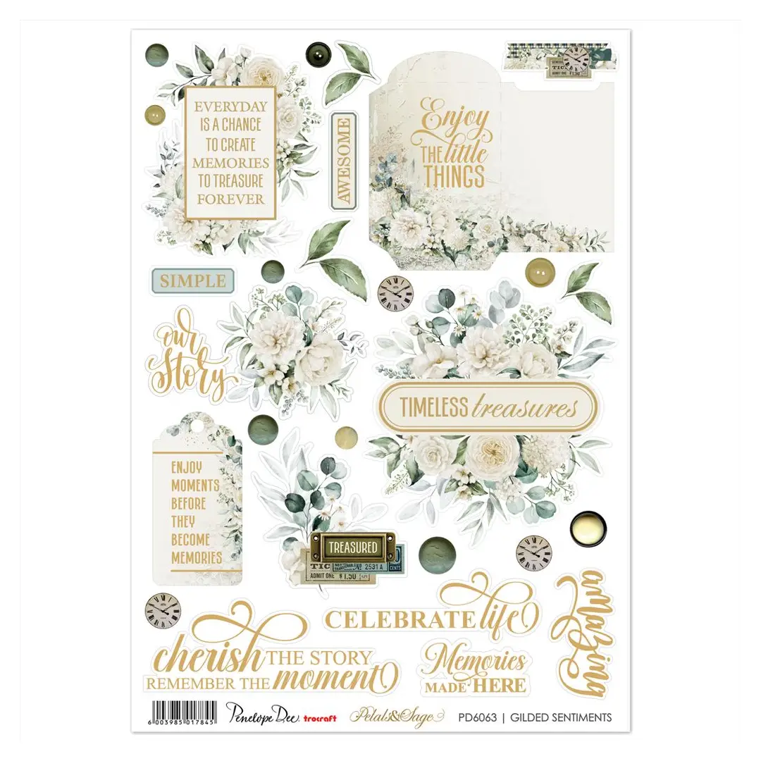 Elevate your paper crafts with Gilded Sentiments Cut Outs by Penelope Dee. This A4 sheet features elegant vintage floral designs in soft green, white, and gold. Each sentiment includes beautiful golden accents that catch the light and add a luxurious touch.