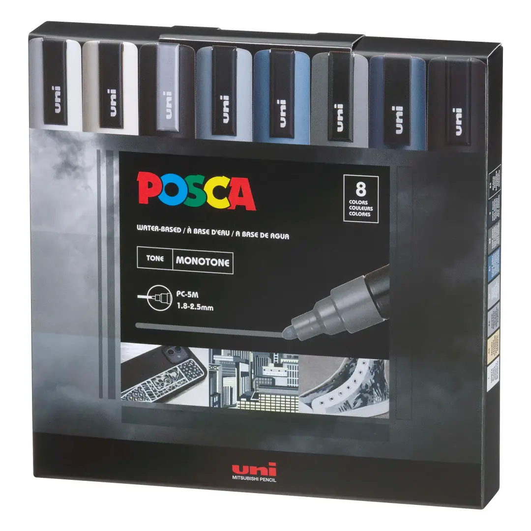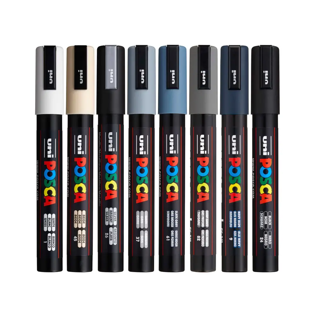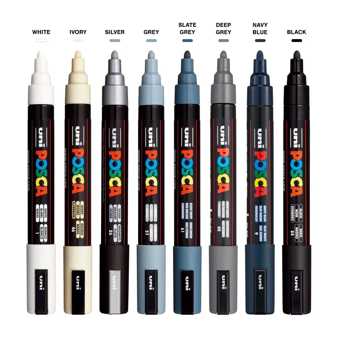 The Posca PC-5M Monotone Colours Marker Set includes eight medium bullet-tip markers (1.8–2.5mm). Featuring black, white, navy, and greys, these non-toxic, quick-drying markers deliver smooth pigment for tonal precision across multiple surfaces.
