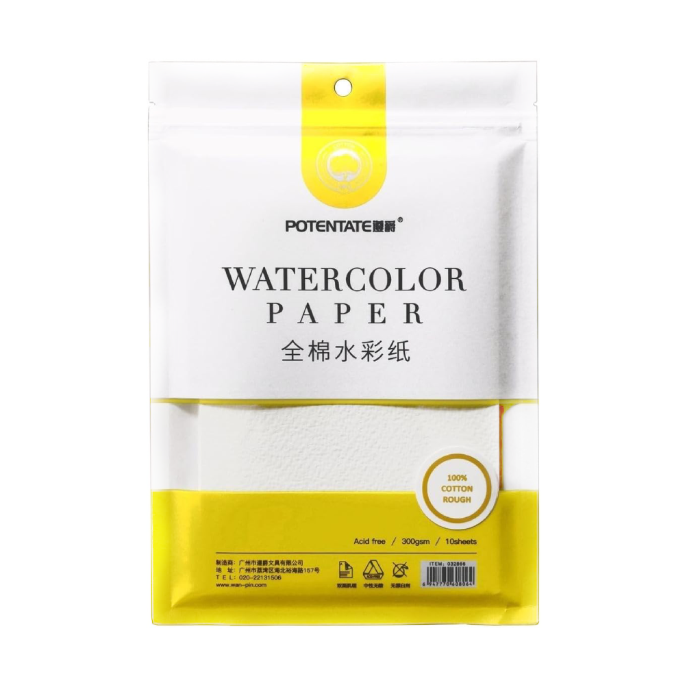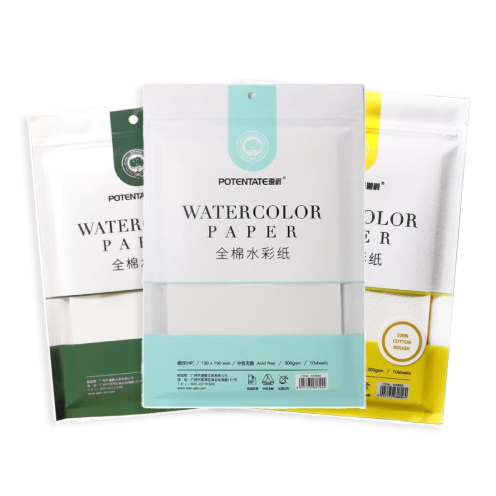 Potentate Watercolour Paper pack include 100% cotton, 300gsm sheets with a balanced texture. Acid-free, and archival – ideal for layering, lifting, and glazing.