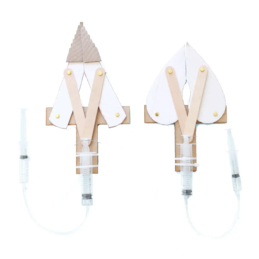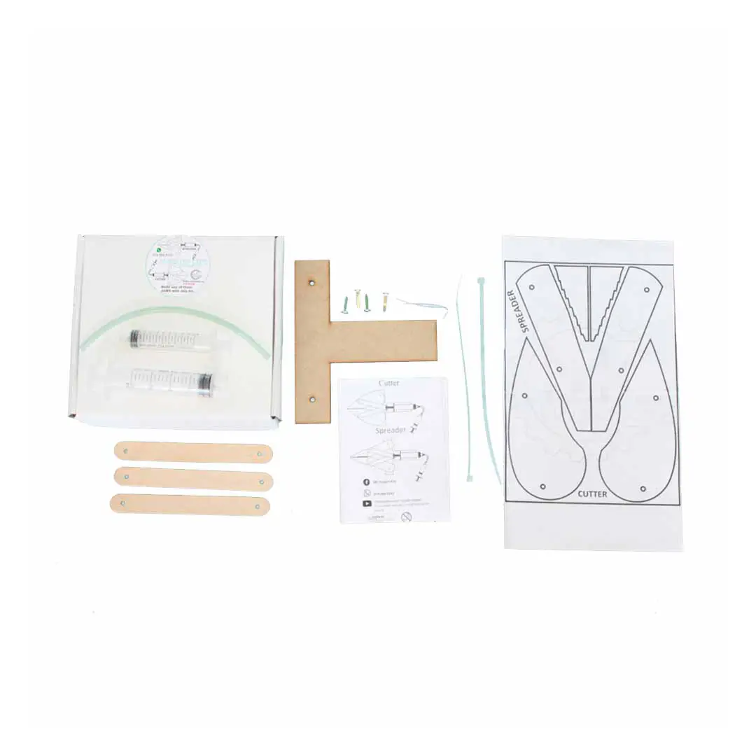Furthermore, the kit includes essential components such as a small bag, wire, split pins, box, T-bar, flat sticks, tubing pipe, paper jaws, syringes, and cable ties. Additionally, the box is used to draw and cut out the spreader or cutter design.