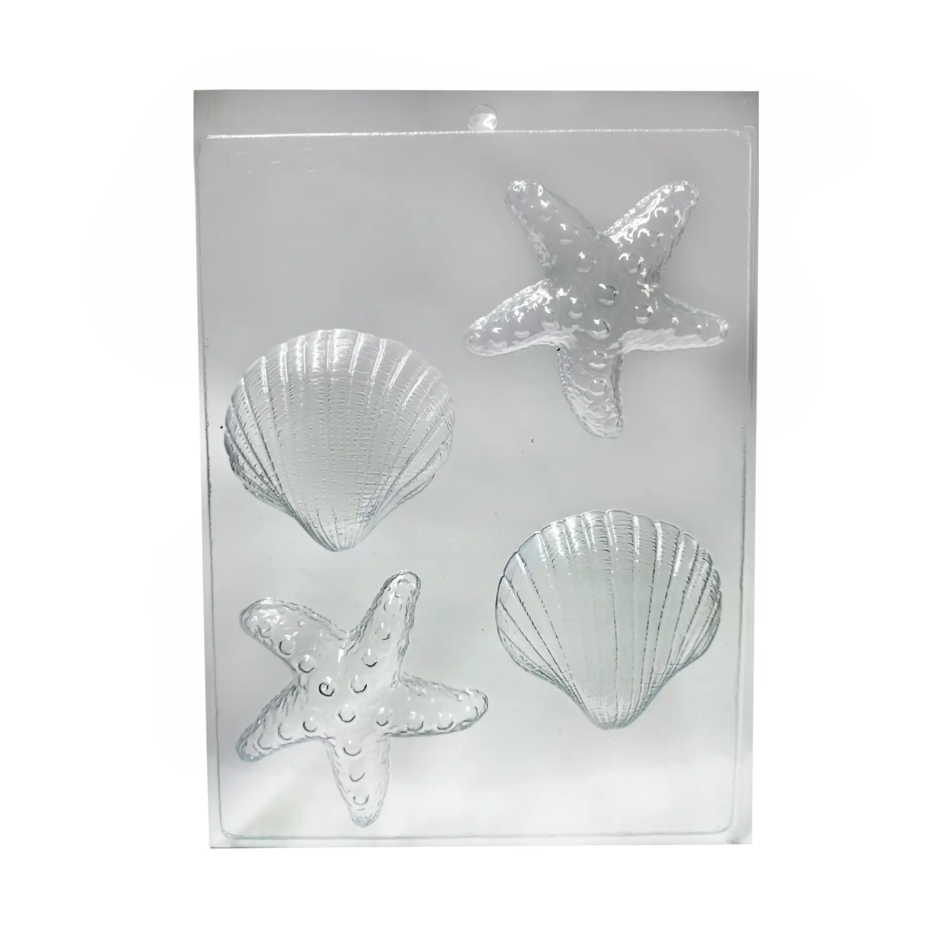The Starfish & Shell PVC Soap Mould comes in clear plastic and makes 4 ocean themed soaps. You can reuse your mould several times.