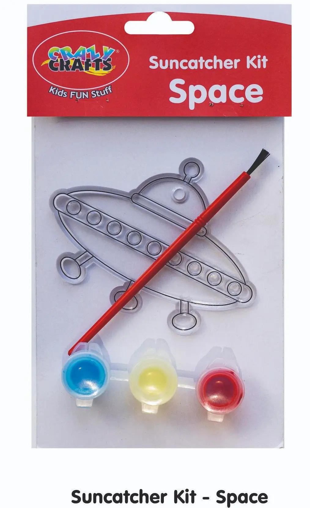 - Includes 1 space-themed suncatcher, 5 paints, and a brush