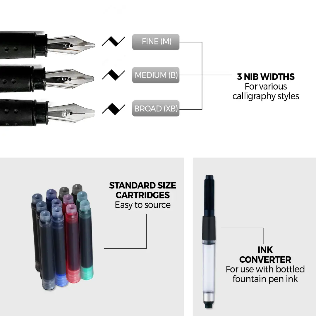 Firstly, the set includes 3 right handed fountain pens, each with its own cap to prevent nibs from drying out. Moreover, you receive 3 calligraphy nib sections in fine, medium, and broad sizes, allowing you to experiment with different lettering styles.